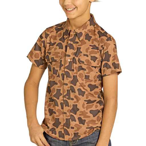 PanhandleStyle # BBN3S07674 This Rock & Roll Denim boy's shirt combines practical design with everyday comfort. The camel-colored short sleeves feature ...