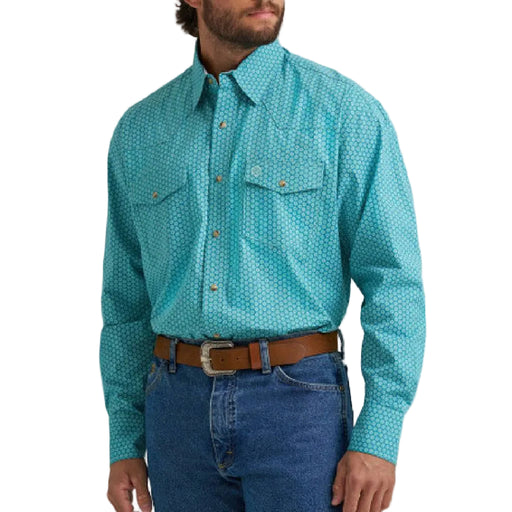 WranglerStyle # 112374599 Elevate your wardrobe with this Wrangler men's shirt featuring a striking turquoise geometric print that works hard as you do. Th...