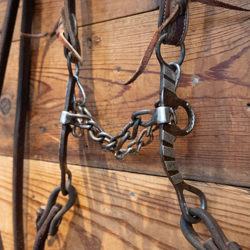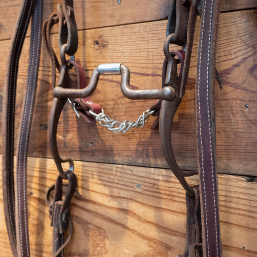 Kerry KelleyMaker: Kerry Kelley Headstall: Single Ear Reins: Roping Reins Mouthpiece: Milk Man Hinge POrt Curb: Chain Shank: #7 - 8"
