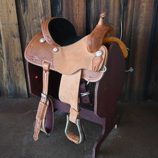 Seven SaddleThis new 15" Seve Lightweight (Wood Tree) Barrel saddle comes in an antique 1/2 floral tooling with a padded seat. For more information call a sadd...