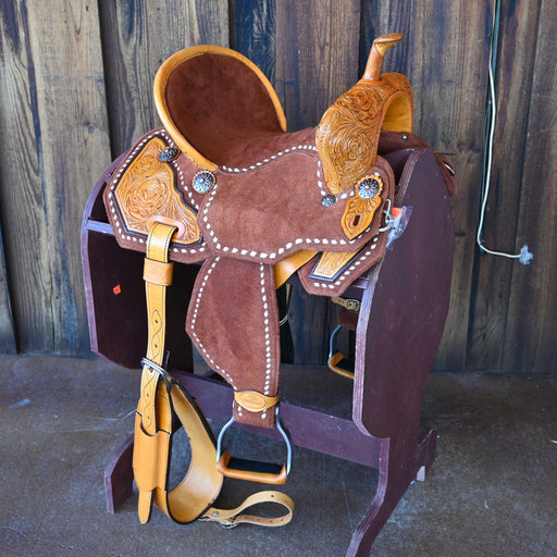 Teskey's SaddleryThis new 12"Teskey's Youth Barrel saddle comes in a heavy oil 1/2 basket and floral tooling with a padded seat. For more information call a saddle ...