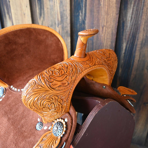 Circle Y SaddleryThis used 14.5" Circle Y Treeless barrel saddle comes in a heavy oil floral tooling with a padded seat. For more information call a saddle salesman...