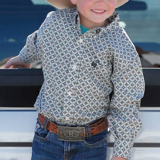 CinchStyle # MTW7061405 Dress your little cowboy in style with this charming Cinch button-down featuring an eye-catching cream and turquoise geometric p...