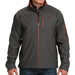 This Cinch men's bonded jacket in charcoal features a red zipper and a single chest pocket alongside hip pockets for convenient storage. Designed with the Cinch logo, it offers water and wind resistance as well as quick-drying properties for optimal performance.