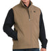This vest in khaki canvas is detailed with black embroidered logos and features a windproof finish. It includes zippered hand and chest pockets, a full-length front zipper, and a stand-up collar. Constructed from a cotton and polyester blend, it is tailored with a straight hem for a refined fit.