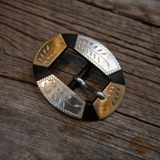 MISCThis slotted concho features a two-tone design with intricate silver-tone etching of a leaf-like pattern set against a darkened base. A detailed bo...