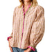 This top features a tan and multi-colored floral striped print with long sleeves and ruffle accents. It has a flattering V-neckline and is crafted from 100% cotton for comfort.