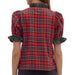 This top features a red and multi-colored plaid design with short puff sleeves and a contrasting ruffle trim. It has a snap button closure and is made from 100% cotton without lining for breathable comfort.