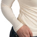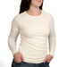 This modern tee in ivory features a long sleeve design with a ribbed texture. Crafted from a soft blend of 95% silk cotton and 5% spandex, it offers comfortable stretch and a smooth feel.