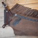 Our Teskey's quality leather shotgun chaps made in a brown roughout with a basketweave tooled double yoke, one silver concho, and two deep pockets for convenience. Great for Show or Ranching.