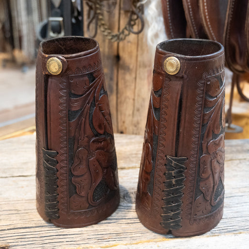 John ClarkVintage tooled Calf Roper by John Clark - Shakopee Mn with Brass dots and one snap closure. These cuffs are in great condition Measurement: 7" Tall