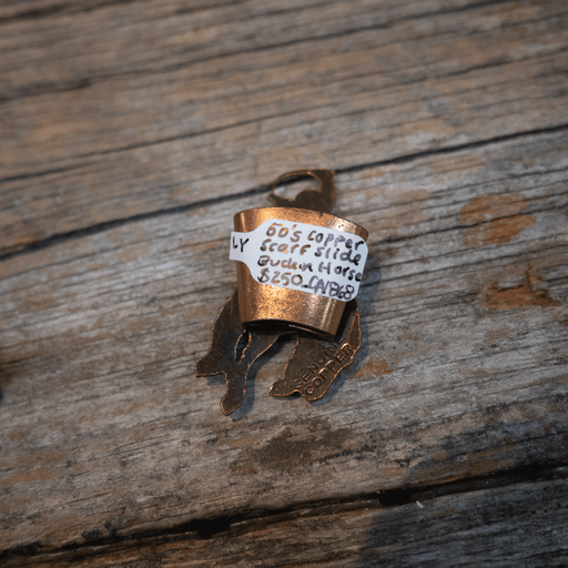 Teskey'sThis 1950's copper made scarf slide from the 1950's has great detail with a bucking bronc cowboy swinger a rope Vintage copper bucking horse scar...