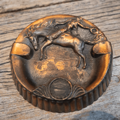 VintageVery unique ashtray from the 1930's-40'2 era, made of copper and metal, designed with a horse stirrup with a bucking bronco, very unique collection...