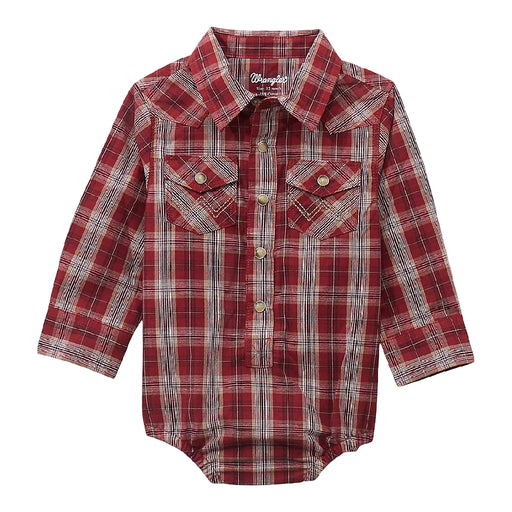 WranglerStyle # PQ1371D Everybody loves the easygoing style of denim, including babies. This long sleeve bodysuit has Western yokes, snap flap pockets, a...