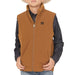 This brown vest is designed without sleeves and features a standing collar with a zipper closure. It offers two hand warmer pockets equipped with zipper closures and includes a quilted lining for enhanced insulation.