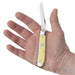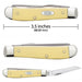 This Mini Trapper is a part of the Yellow Synthetic Family. The distinctive yellow handle brightens this family while maintaining its toughness, making it one of the most beloved in the Case line. Mini Trappers are a smaller version of our Trapper carrying two full length blades, the Clip blade and the Spey blade. The Clip blade is commonly used as a multi-purpose blade and preferred for detail work. The Spey blade is commonly used as an all-purpose utility blade. The basic trapping and skinning blades make this a must-have knife for those who trap small game. This knife is constructed with our Carbon (CS) steel. Some knife lovers will settle for nothing less than Carbon Steel blades, since this special formula of alloyed steel is the "original" Case blade steel. Case Carbon Steel blades are known for their edge-holding ability and easy re-sharpening. However, they are less resistant to rusting, pitting and discoloration than stainless steel. We recommend keeping a thin film of oil on the blade to maintain the finish. This ensures that your knife will be around for future generations to enjoy. Comes conveniently packaged in a box. Made in Bradford, PA, USA from domestic and imported materials.