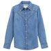 This medium wash women's denim shirt features long sleeves, pearl snap closures down the front placket, and faux smile chest pockets. Designed with classic western yokes, it combines style and structure in a blend of 88% cotton and 12% hemp for comfort and durability.