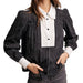 This Victorian Lace Top features a black and white color scheme with long puffed sleeves, a delicate Peter Pan collar, and eyelet lace trim. It closes with a button-down front, combining classic elegance with refined detailing.