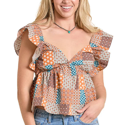 View full detailsRock & Roll Denim Women's Patch Print Flutter Sleeve Rust Tank Top