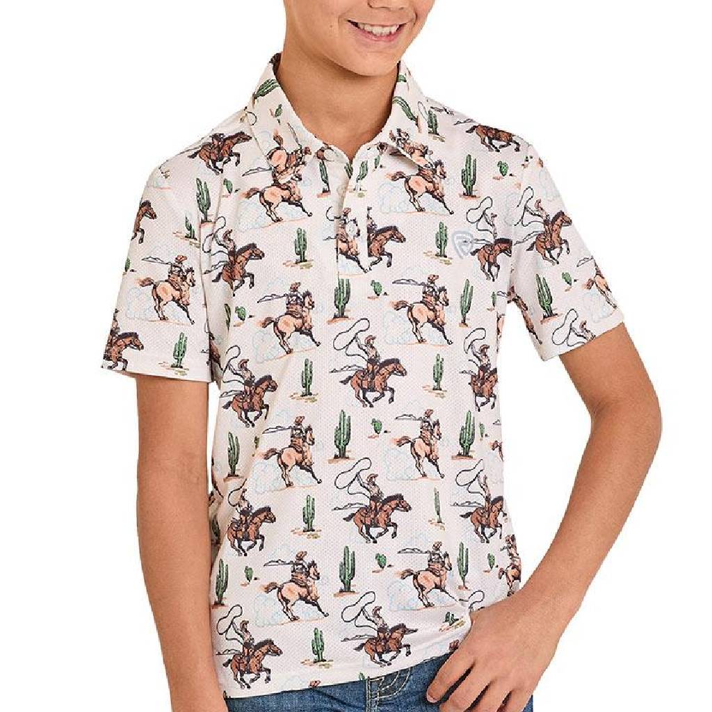 PanhandleStyle # BB51T08356 The Boy’s Natural Rider Print Polo captures the spirit of the open range with a playful all-over cowboy and horse print set agai...