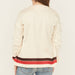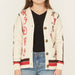 This cardigan comes in a cream color and is made from 100% polyester. It features a V-neckline and long sleeves with a button-down front. The design includes brown and red details, showcasing a "Rodeo" rope motif on the front, complemented by spur and cowboy boot accents.