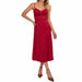 This sleeveless midi dress in red features a satin bustier bodice, a convenient zipper closure, and a flattering side slit for added movement and style.