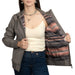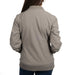 This women's bonded jacket features a grey base with pink accents, a full zipper closure, and a striped print lining. It includes a single chest pocket and hip pockets for convenient storage, along with ribbed cuffs and hem for a secure fit. Crafted from 83% nylon and 17% spandex, it offers a comfortable blend of durability and stretch.