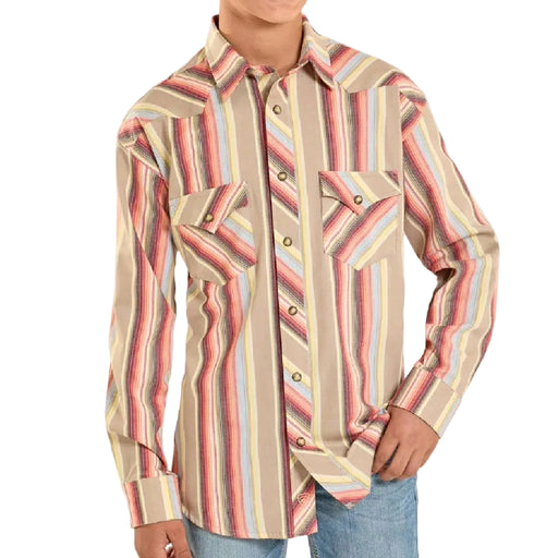PanhandleStyle # BBN2S08309 The Rock & Roll Denim Boy's Vintage Stripe Brown Pearl Snap Shirt features a classic brown and multi-color vintage stripe pr...