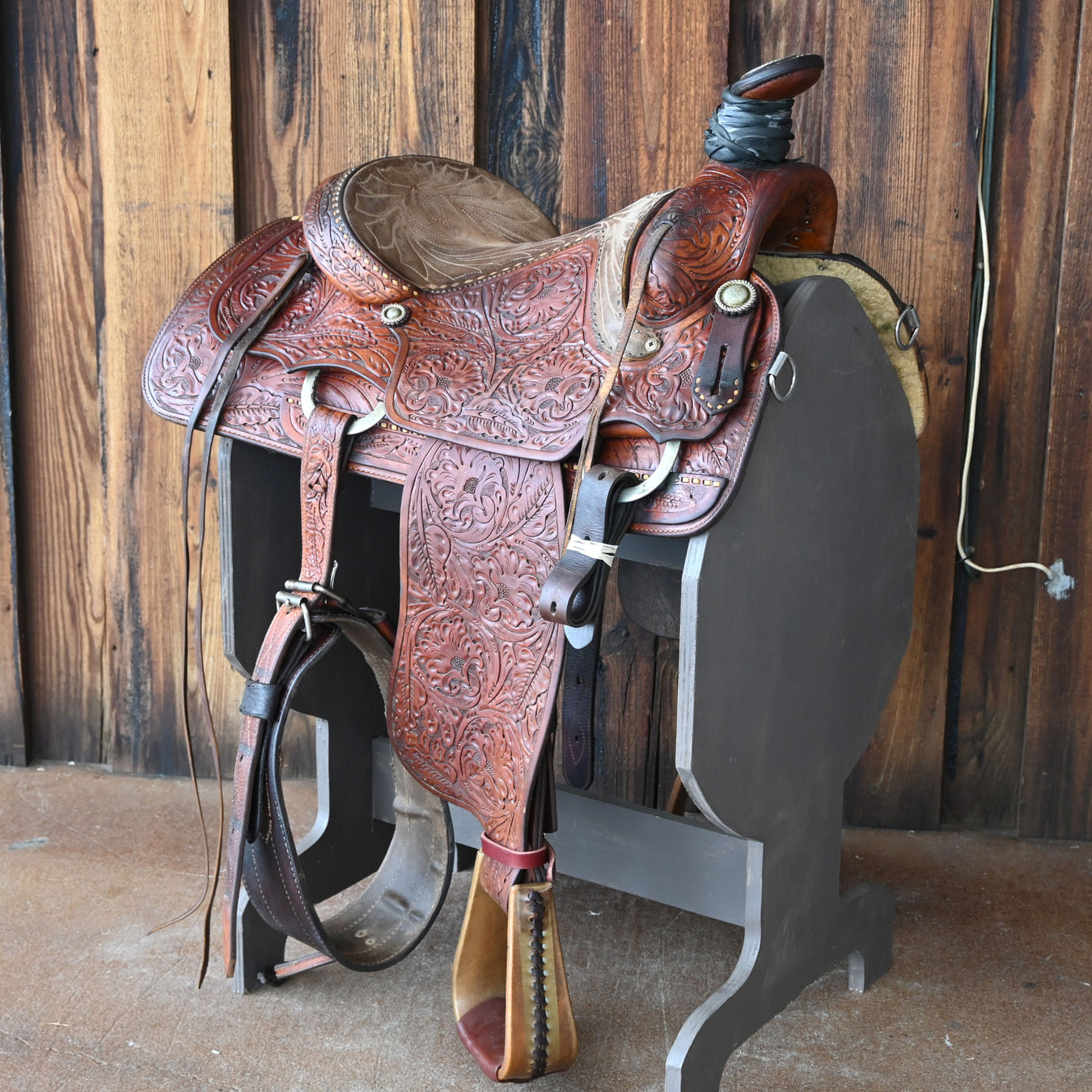 Gary AnglinThis used 16" Gary Anglin Ranch saddle comes in a heavy oil floral and trophy tooling with a padded seat. For more information call a saddle salesm...