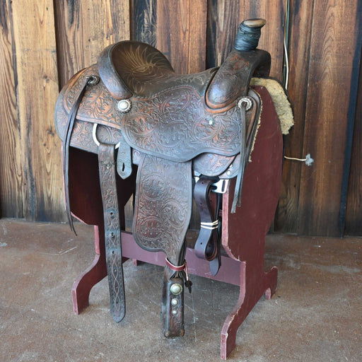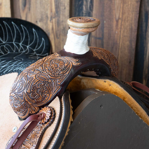 Miller LeatherThis used 15.5" Miller Leather Team Roping saddle comes in a heavy oil floral tooling with a lightly padded seat. For more information call a saddl...