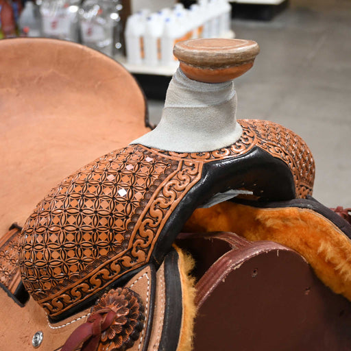 NRSThis used 15.5" NRS Team Roping saddle comes in a heavy oil geometric tooling with a hard seat. For more information call a saddle salesman today a...