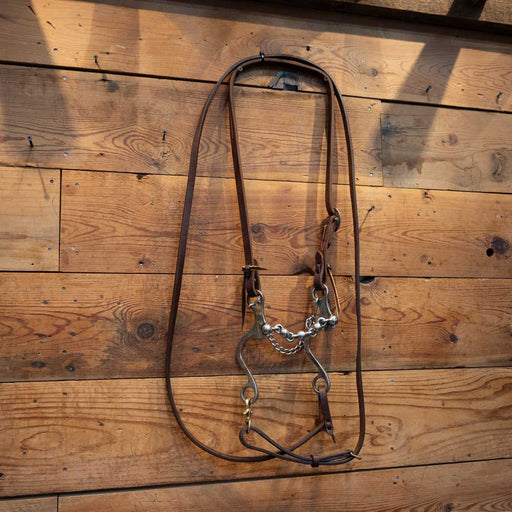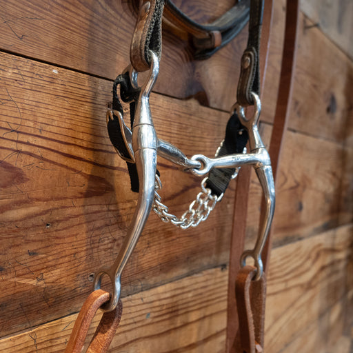 TrammellMaker" Trammell Shank: 8 1/2" Mouthpiece: Solid Port Headstall: Single Ear with Rawhide Accents Reins: Split reins Curb: Chain wit...