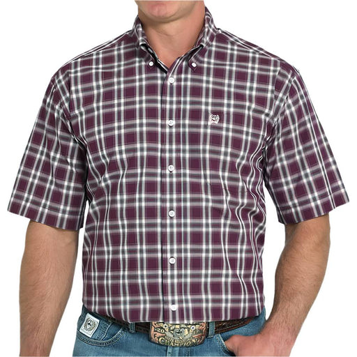 CinchStyle # MTW1111484 This men's button-down shirt features a purple plaid pattern with short sleeves and an open left front pocket. Crafted from 100%...