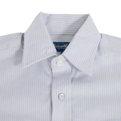 PanhandleStyle # SBN2S07610 This classic boy's western shirt features a striking blue stripe pattern with authentic pearl snap buttons for easy dressing. Cr...