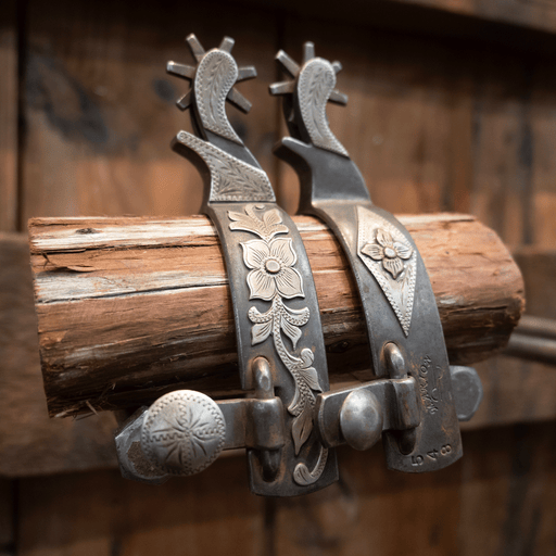 J JonesEnhance your riding experience with J JONES Silver Mounted Spurs. The silver longhorn and flower design on the cuffs adds a touch of personal style...
