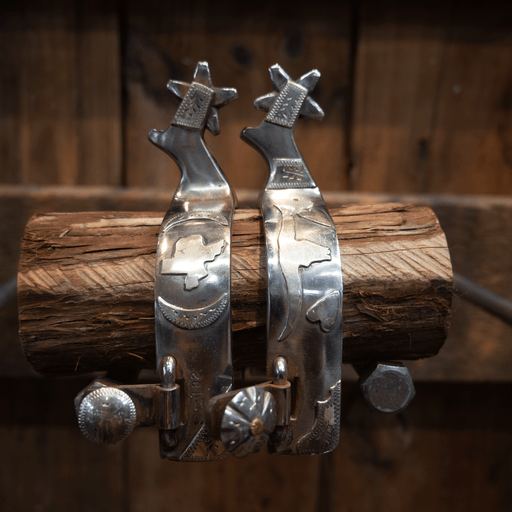 View full detailsRicky Trammel Silver Texas and Longhorn Mounted Spurs 5 pt Rowels