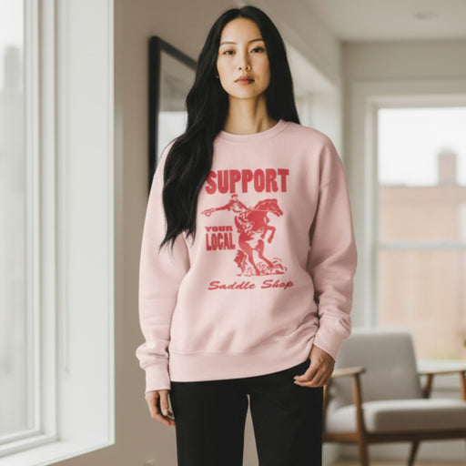 Style # 2R25SCCRW This cozy sweatshirt comes in a lovely dusty pink color and features a "Support Your Local Saddle Shop" graphic on the front. It'...