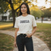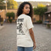 This tee features an ivory hue and short sleeves, with the front displaying "Teskey's Saddlery" and the back showing "Support Your Local Saddle Shop." Made with 100% cotton for ultimate comfort.