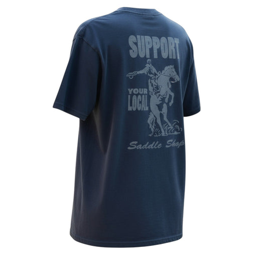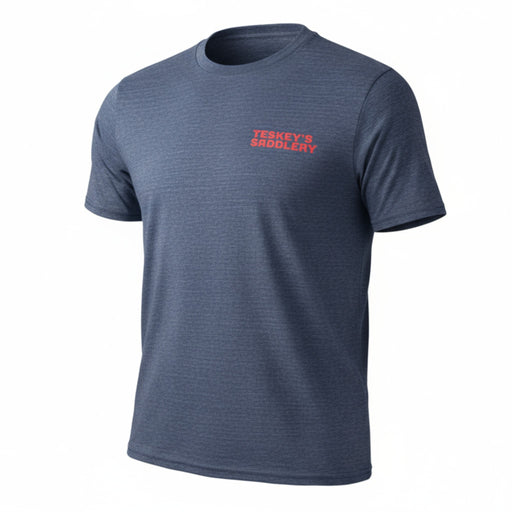Teskey'sStyle # 2PBS3OTR This tee features an indigo hue and short sleeves, with the front displaying "Teskey's Saddlery" and the back showing "Support Yo...