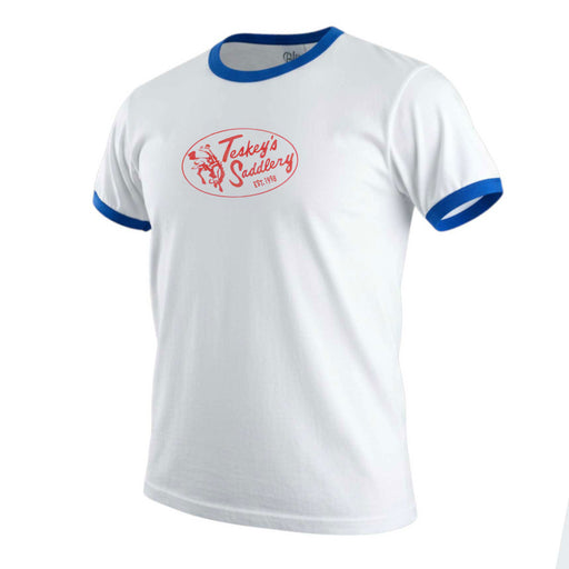 Teskey'sStyle # 2PBSPR1007 The Teskey's Saddlery Retro Tee is made from 100% cotton and features a color combination of red, white, and royal blue. The shi...