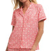The product features a red gingham print, collared neckline, short sleeves, and a button front closure. With a chest pocket, this top is made with a lightweight fabric and has a regular fit. It is constructed with 95% polyester and 5% spandex for added comfort.