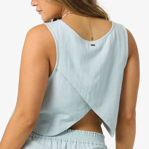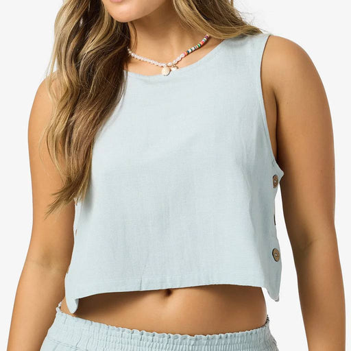 O'NeillStyle # SP2640411 This cute woven tank top features a skimmer length fit, functional side seam buttons, and wrapover back detail. Color: Cloud Blu...