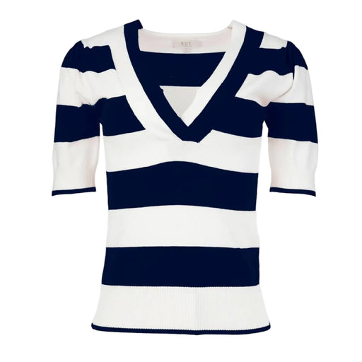 Kut from the KlothStyle # KS40301 The Kut Yona Striped V Neck Sweater in white and navy combines classic style with comfortable everyday wear. This short-sleeve swea...