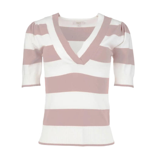 Kut from the KlothStyle # KS40301 The Kut Yona Striped V Neck Sweater in white and blush combines classic style with comfortable everyday wear. This short-sleeve swe...