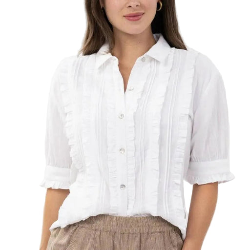 Ivy JaneStyle # 641496 Effortlessly blend classic tailoring with breezy comfort in the White Tuxedo Gauze Top. This shirt is a standout piece for the seaso...