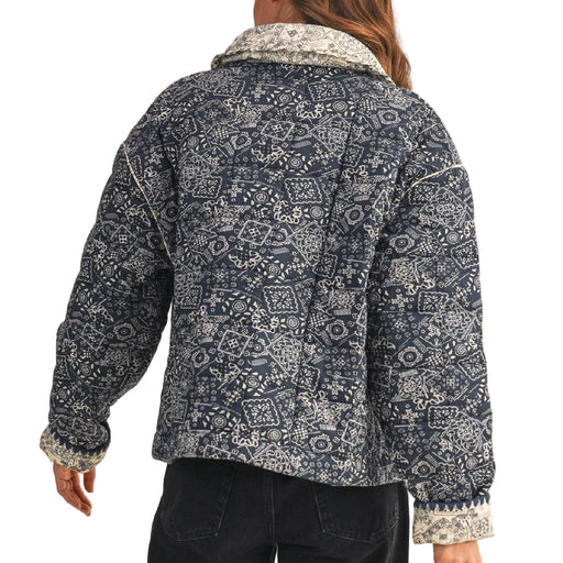 En MerciStyle # MJK4121 This refined navy jacket showcases a striking quilted bandana print with thoughtfully placed contrast details throughout. The desig...