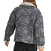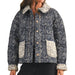 This refined navy jacket showcases a striking quilted bandana print with thoughtfully placed contrast details throughout. The design features a distinctive ruffled collar, button-front closure with piping accents, and relaxed drop shoulders. Long sleeves are finished with folded cuffs adorned with blanket triangle stitching, while patch pockets echo the same decorative stitch work. The fully lined construction and contrast piping along the placket elevate the overall aesthetic, creating a polished piece that balances visual interest with understated elegance.