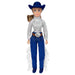 Cassidy is ready for the show ring in her sparkly white shirt, blue pants with fringe, belt with a big silver buckle, and her cowboy hat and boots. This fully-articulated rider figure stands 8" tall and is ready to complete your Breyer farm setup.