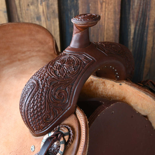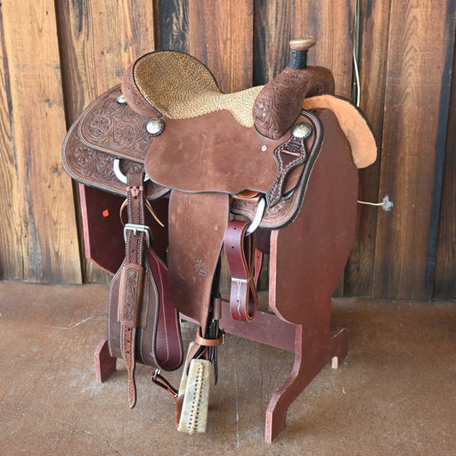 Patrick SmithThis new 14" Patrick Smith Team Roping saddle comes in a heavy oil 1/4 geometric tooling with a hard seat. For more information call a saddle sales...