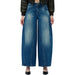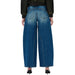 These women's mid-rise jeans feature a unique drop crotch and harem silhouette, blending a relaxed fit with a bold, fashion-forward design. The curved seams and distressed finish add a modern, edgy touch.